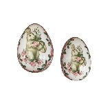 O ovo em cerâmica, é uma peça pintada a mão que retrata em seu centro um coelho com ovo de páscoa e em sua borda desenhos de rosas.