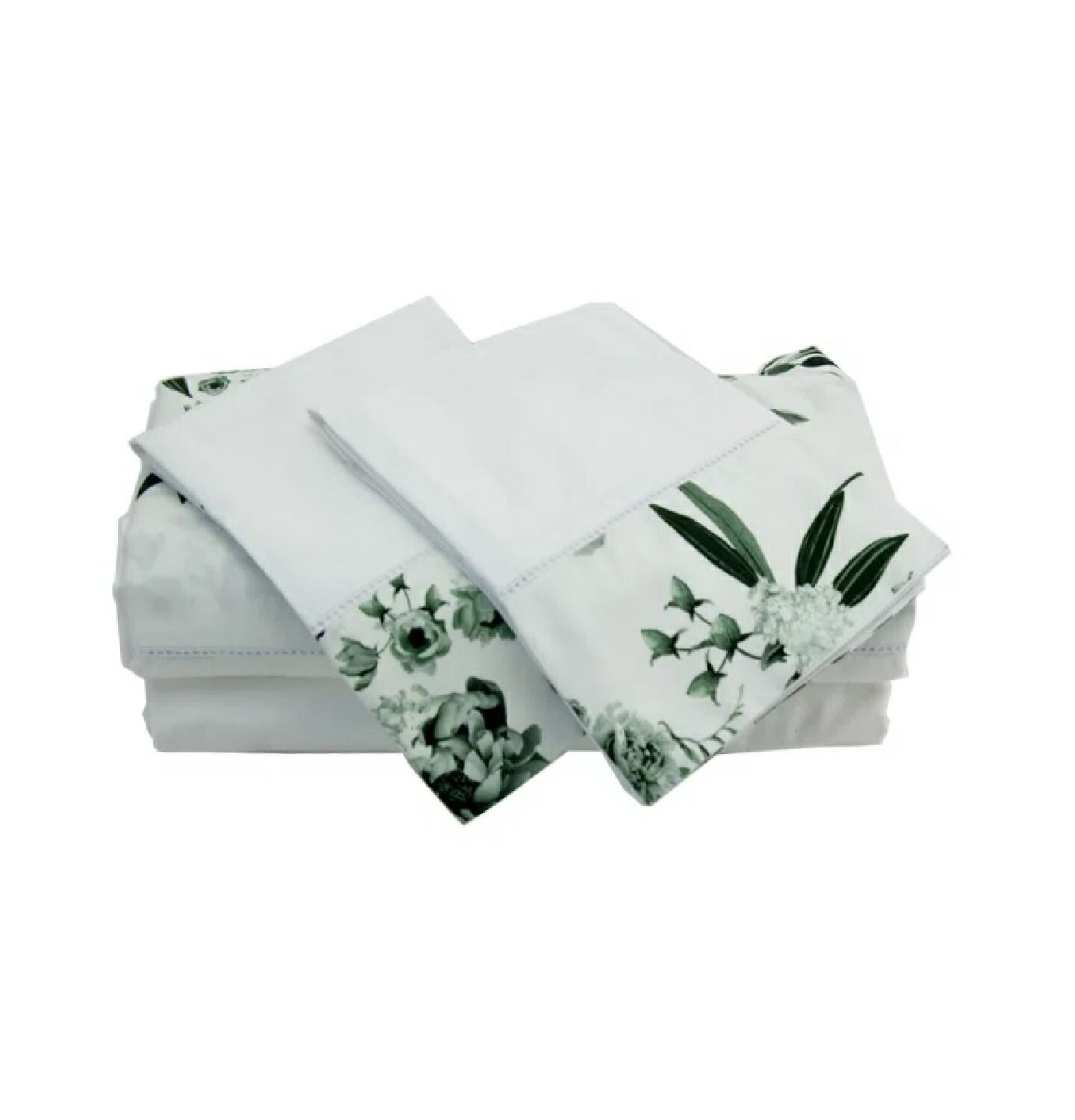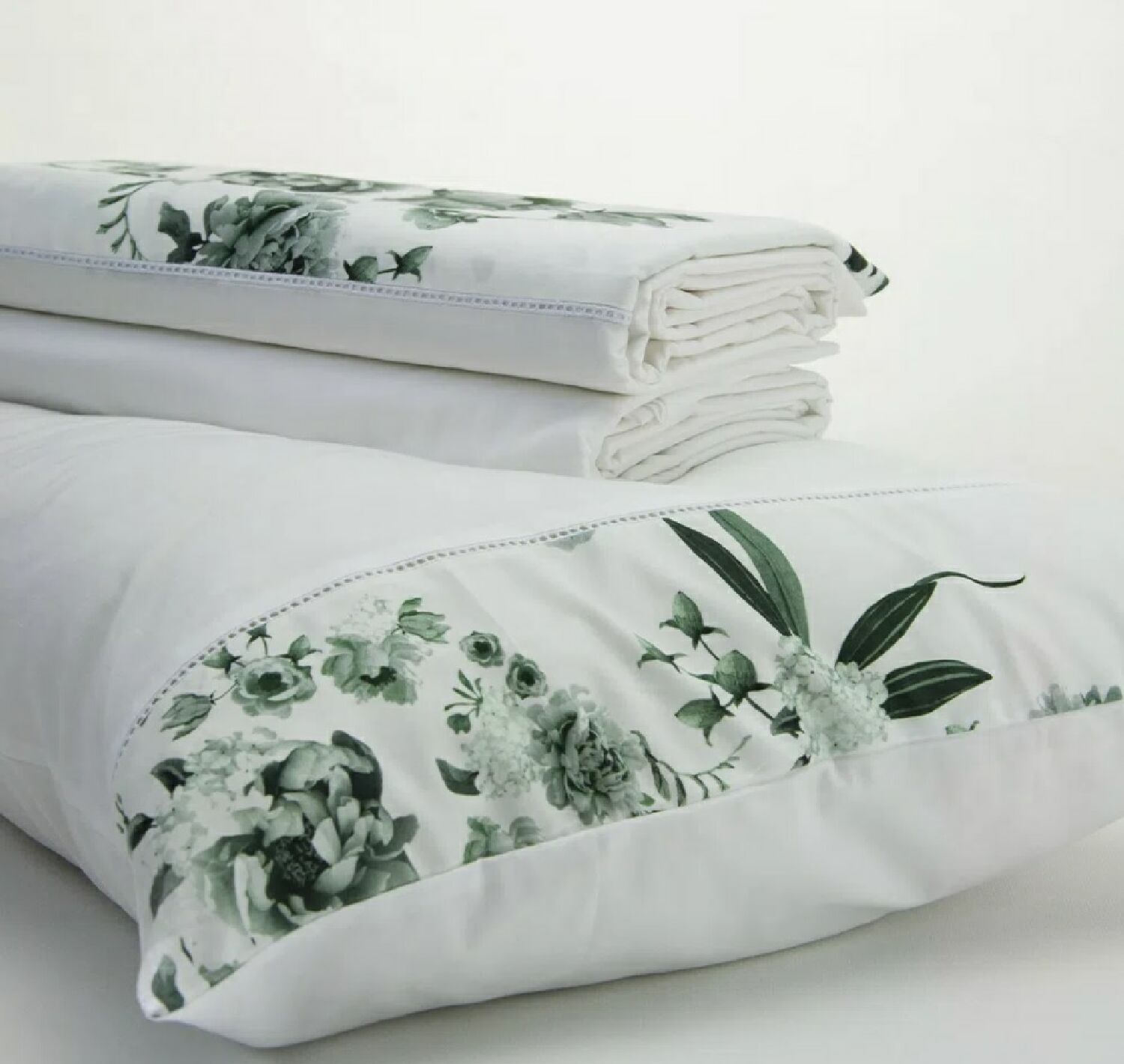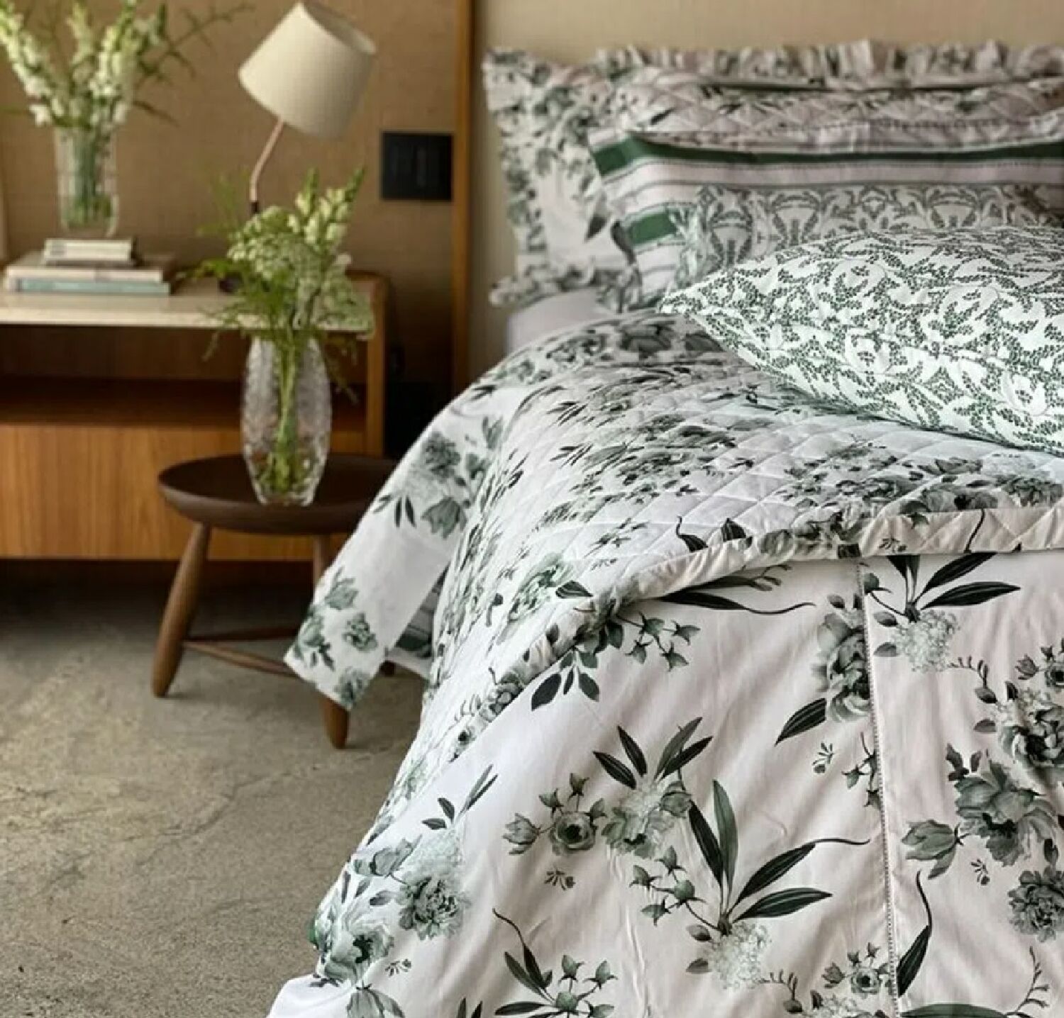 Com um floral exuberante e degrades de verde, essa coleção proporciona as melhores sensações de frescor e bem estar! Toda confeccionada com o exclusivo Algodão Egípcio 230 fios e acessórios em finíssima tricoline 100% algodão.