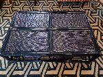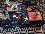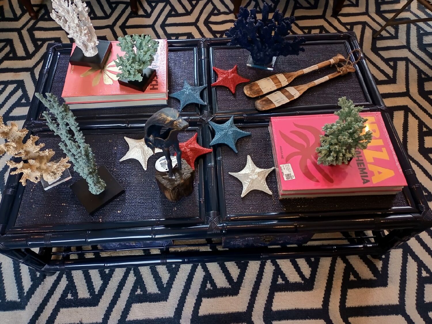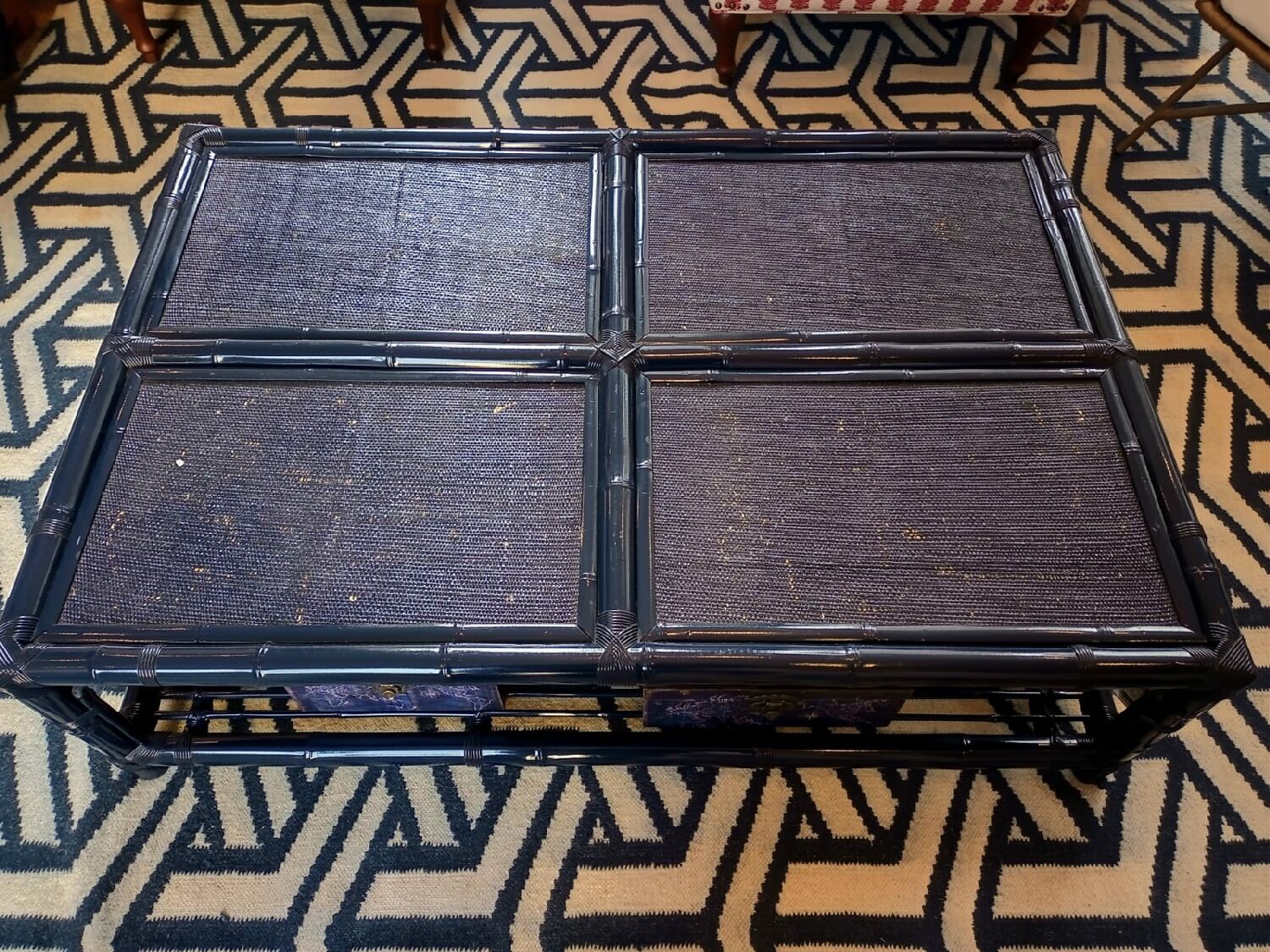 A mesa de centro bambu com palha azul marinho é perfeita para projetos modernos e atemporais.
