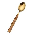 A colher de sobremesa é em aço inox na cor dourado com o cabo em bambu natural, fica perfeito na combinação de sua mesa.