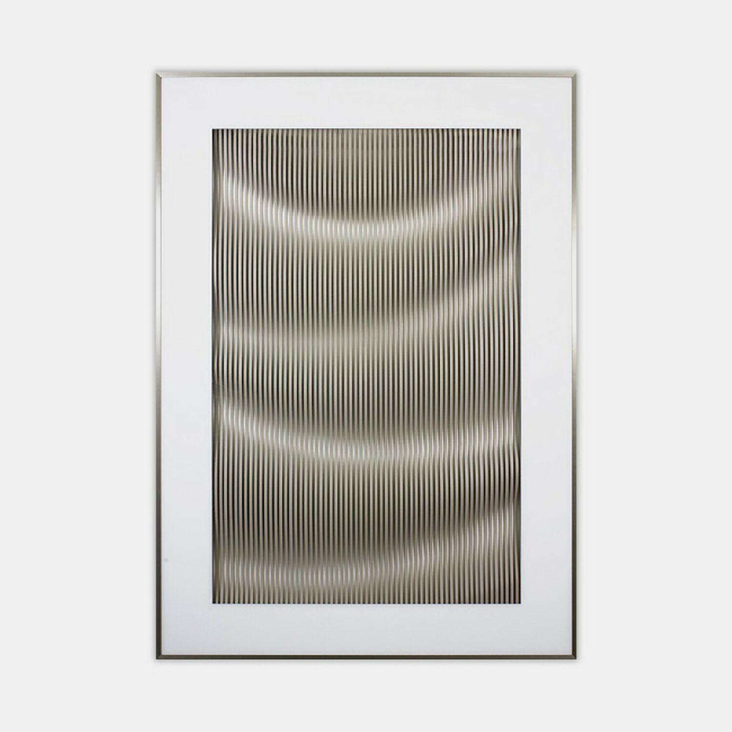 O quadro foi fabricado no Brasil pelo artista Bar Design, sua moldura é uma caixa com perfil de alumínio cinza com vidro branco, a escultura interna é em mdf laqueada na cor cinza.