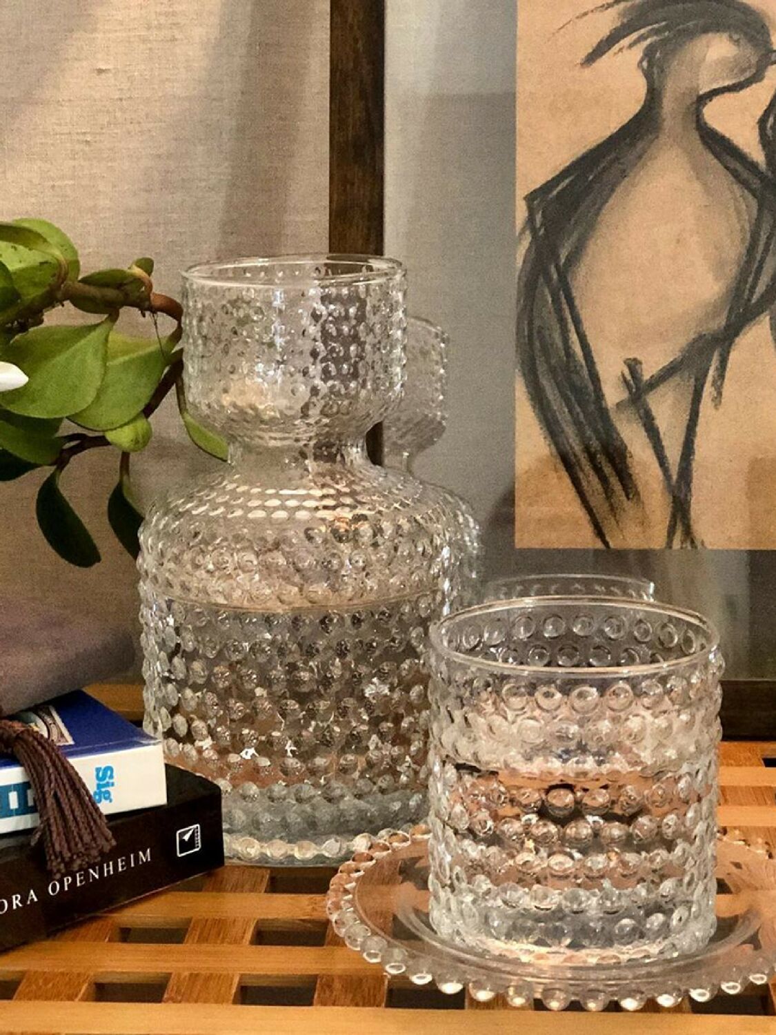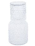 A jarra translúcida é produzida em vidro lapidado. A peça possui tamanho pequeno, formato arredondado e superfície texturizada. Acompanha copo tampa da mesma cor e material.