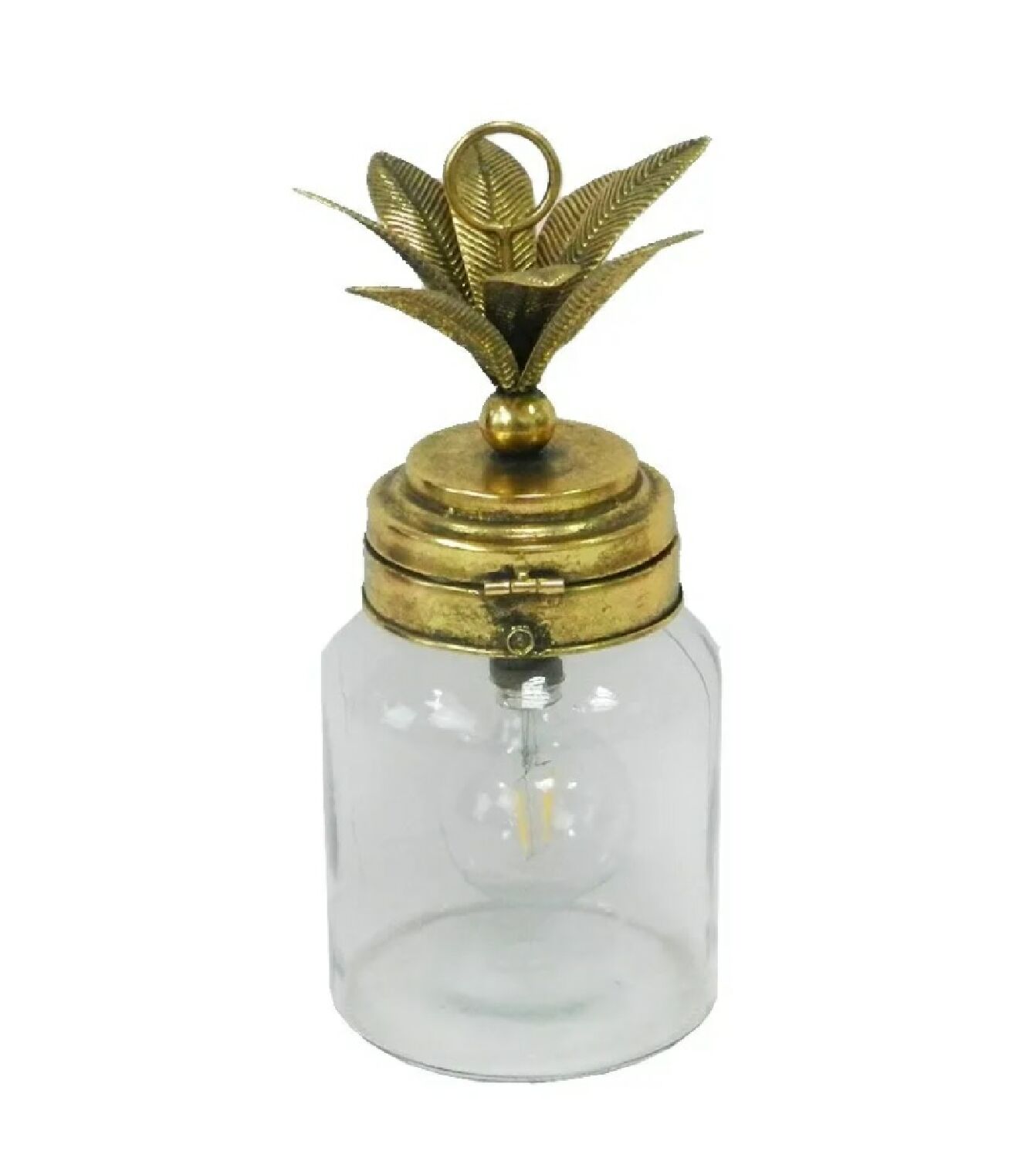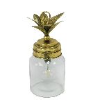 A base é produzida em vidro transparente com uma lâmpada decorativa e luzes de led, a parte superior é feita em metal trabalhado com detalhes em forma de folhas.