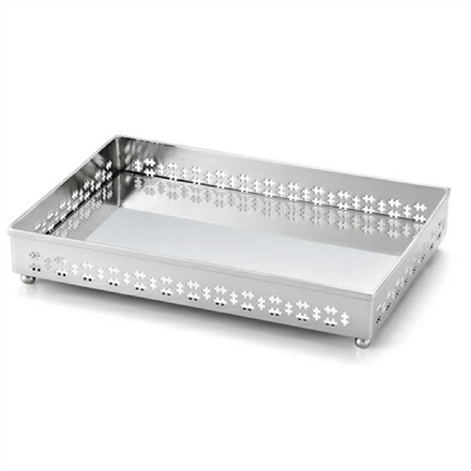 A bandeja retangular Cross pequena prata é fundamental na montagem de um bar em sua casa, ou também fica perfeita em seu lavabo. É uma peça delicada e imponente, com design sofisticado, sua galeria é trabalhada artesanalmente.