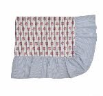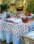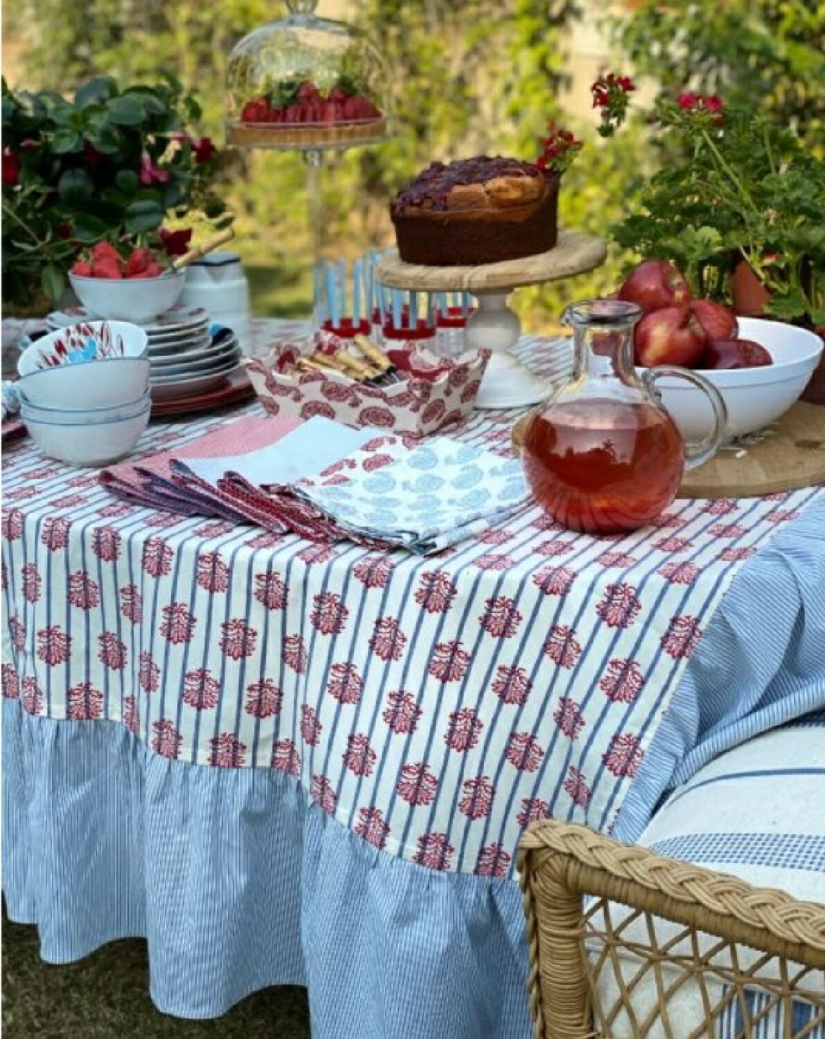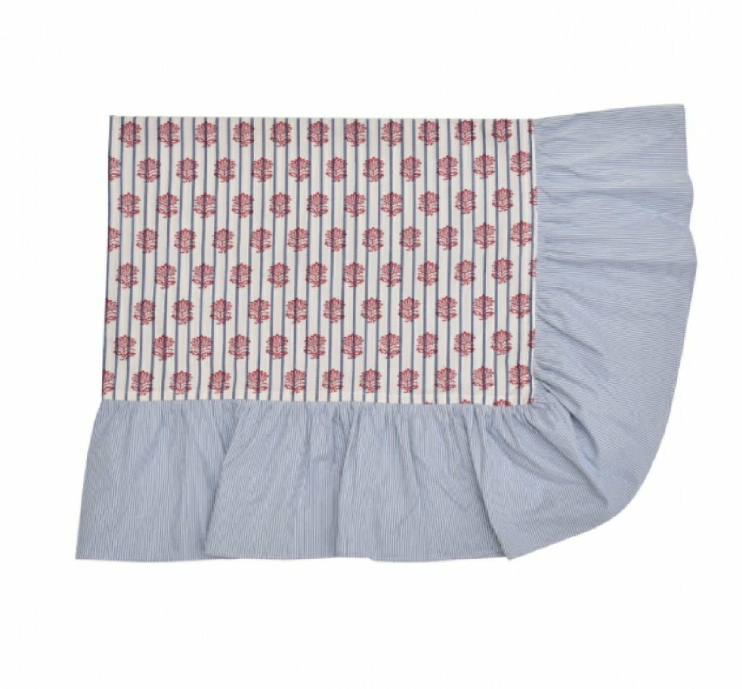 Uma mesa montada com carinho deixa o momento ainda mais gostoso, e uma toalha com estampa única e cheia de detalhes faz toda a diferença. Toalha com estampa em tons de vermelho e off-white e babado azul listado. Fica ainda mais especial combinada com outros itens da linha Entreposto Taste.