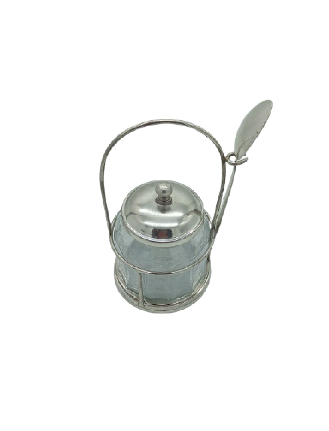 O pote com colher é em metal, pode servir com açucareiro dentre de varias outras opções.