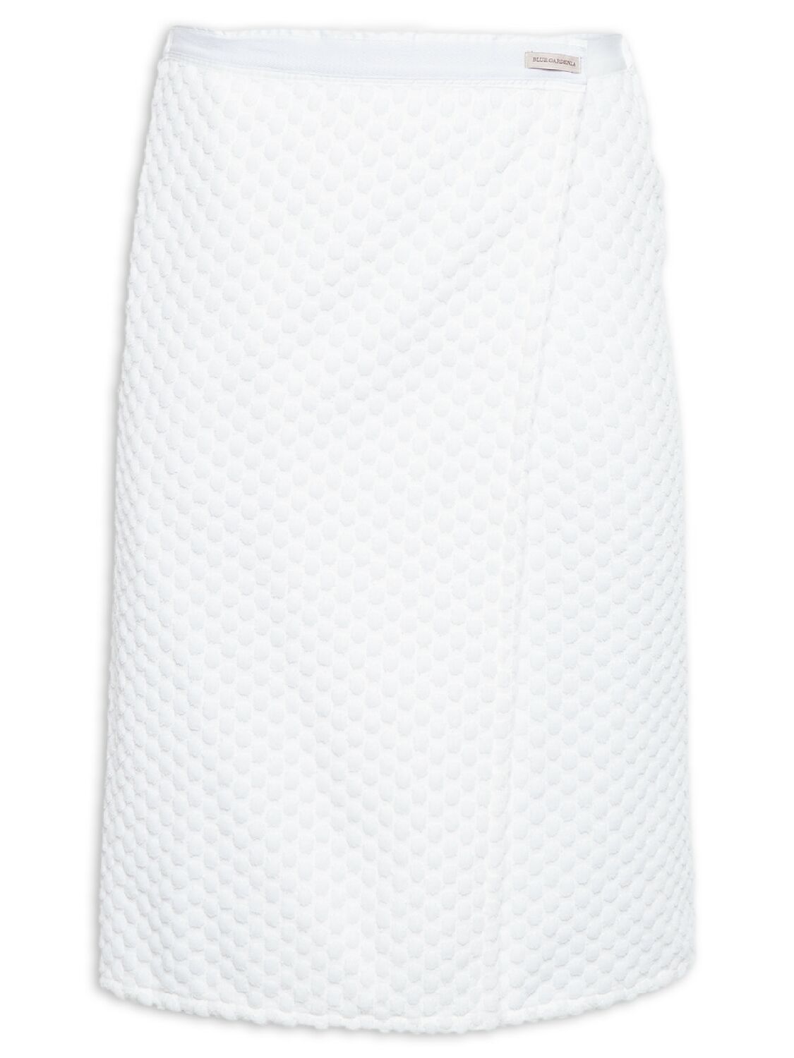 A toalha branca é confeccionada em tecido atoalhado com superfície texturizada. A peça possui tamanho grande, tag da marca aplicada e acabamento pespontado.